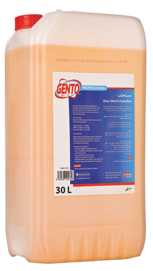 Gento Professional One Shot Emulsifier is a soluble concen- trated liquid detergent, which provides low from when added water. It contains mild anionic, non-ionic surfactnts and chelating agents.